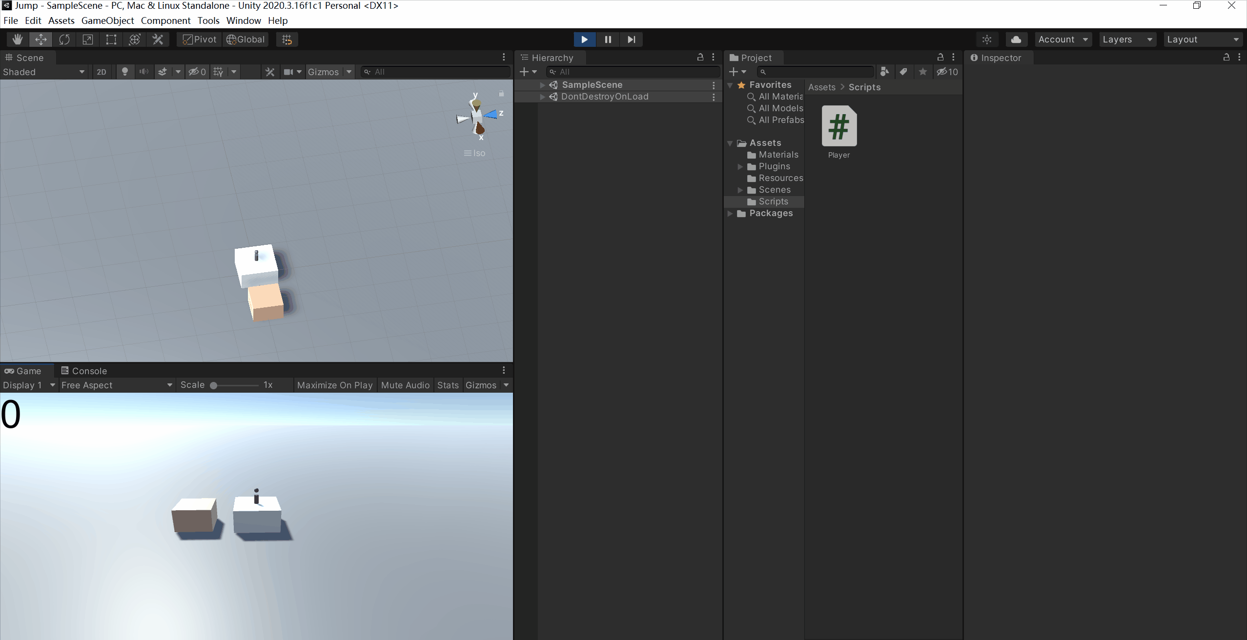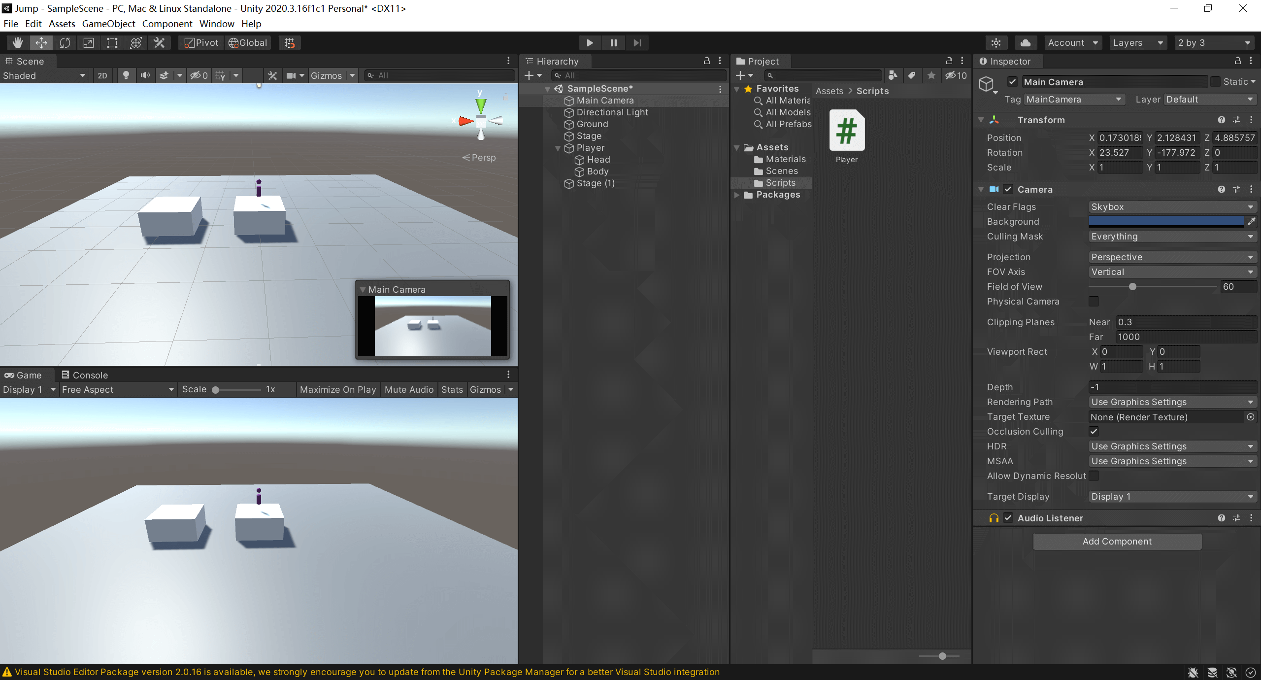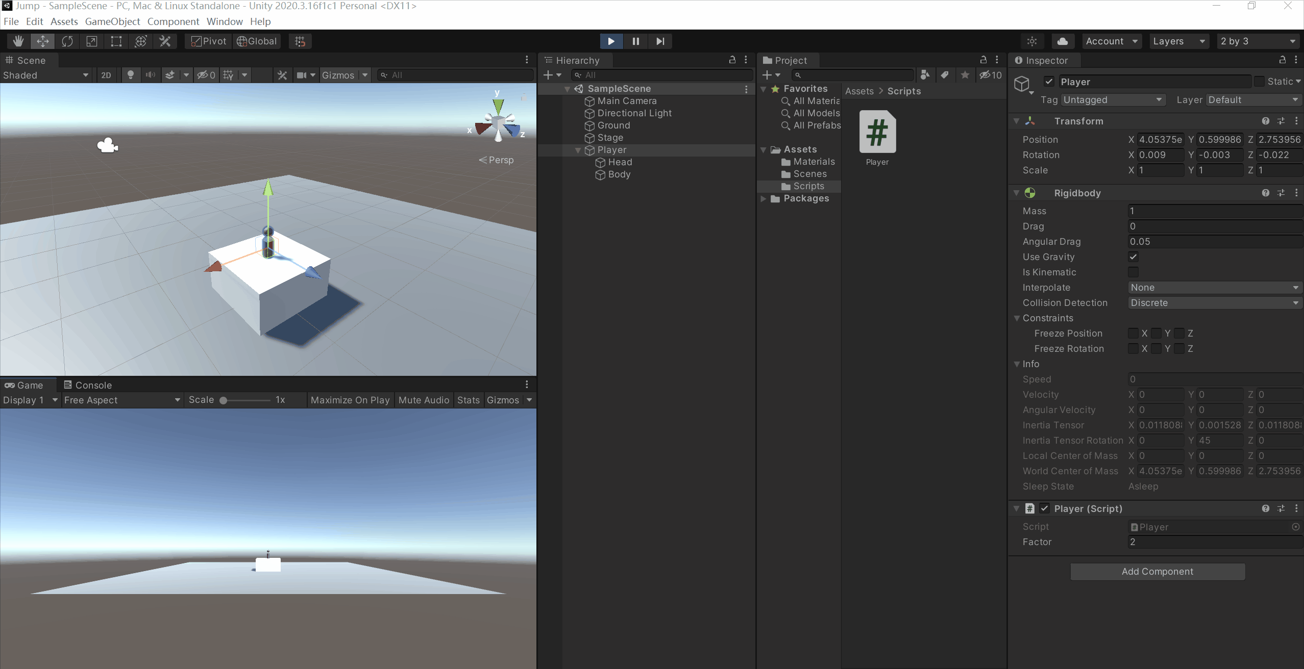 Player放入新创建Scripts文件夹,并将脚本绑定到Player控件上,并在Player控件上添加一个物理组件Rigidbody