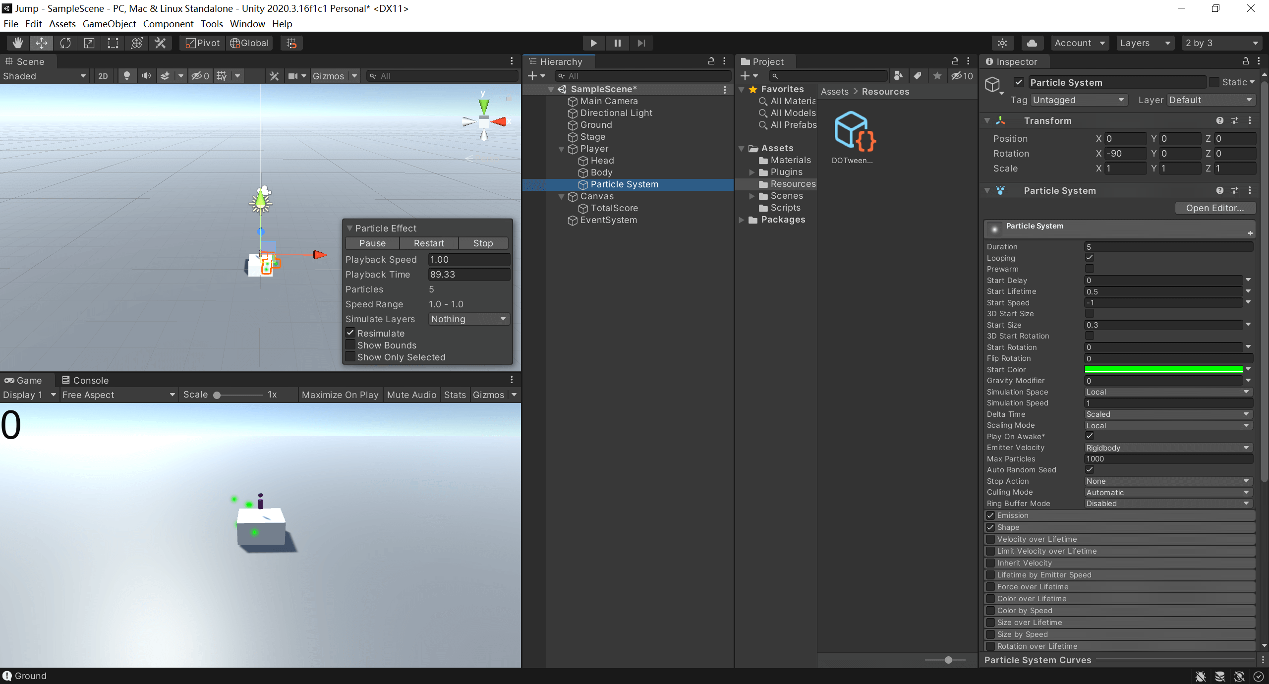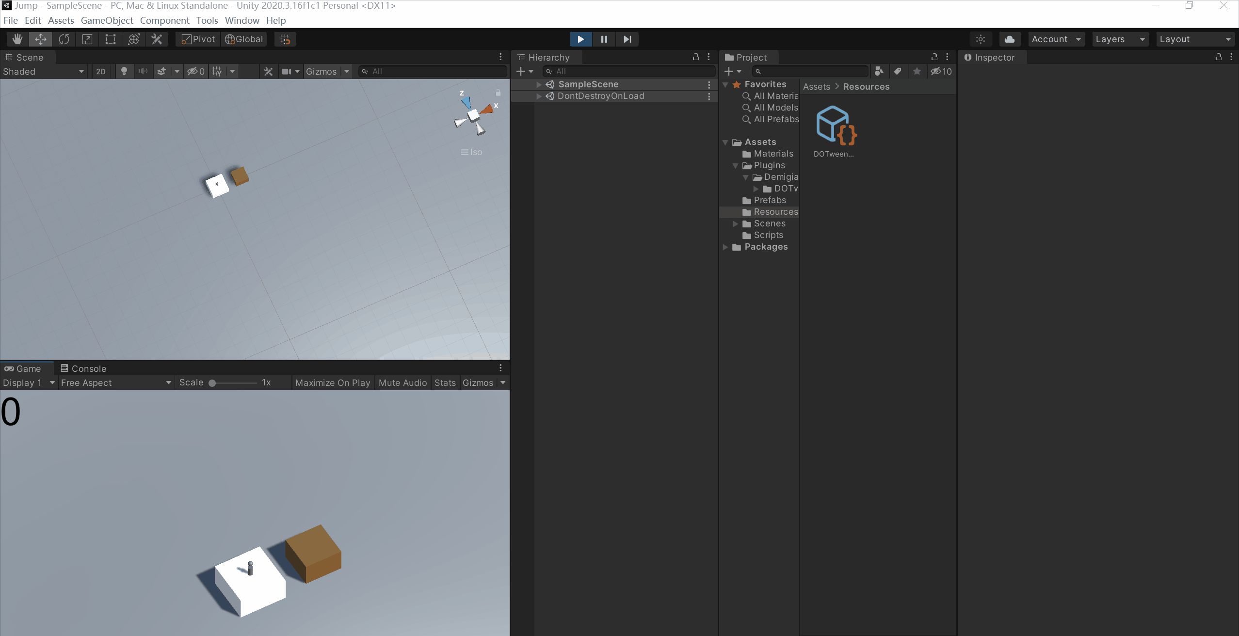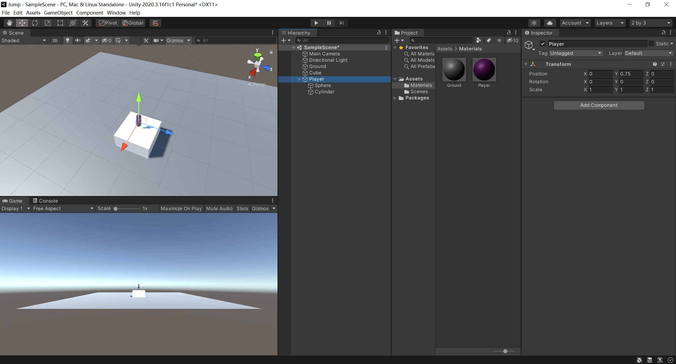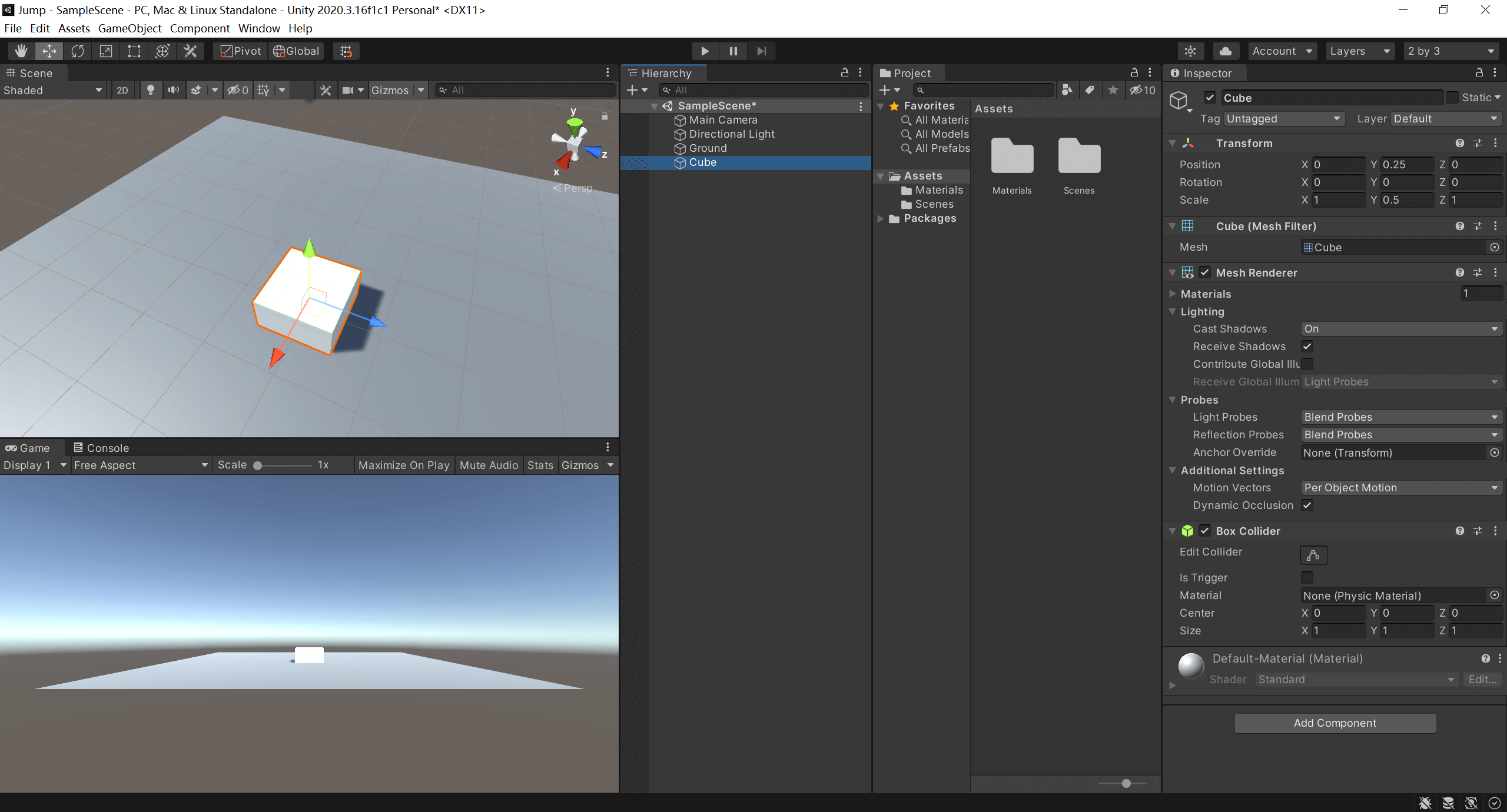 Cube,y轴缩放0.5当跳板,创建物体可以通过Transsform中Reset设置为3D场景正中心,在创建一个Plane当地面,跳一跳小人物碰到地面时游戏借宿,为了让跳板出现地面上方,设置y轴Postion为0.25(Reset设置居中是以组件正中心)