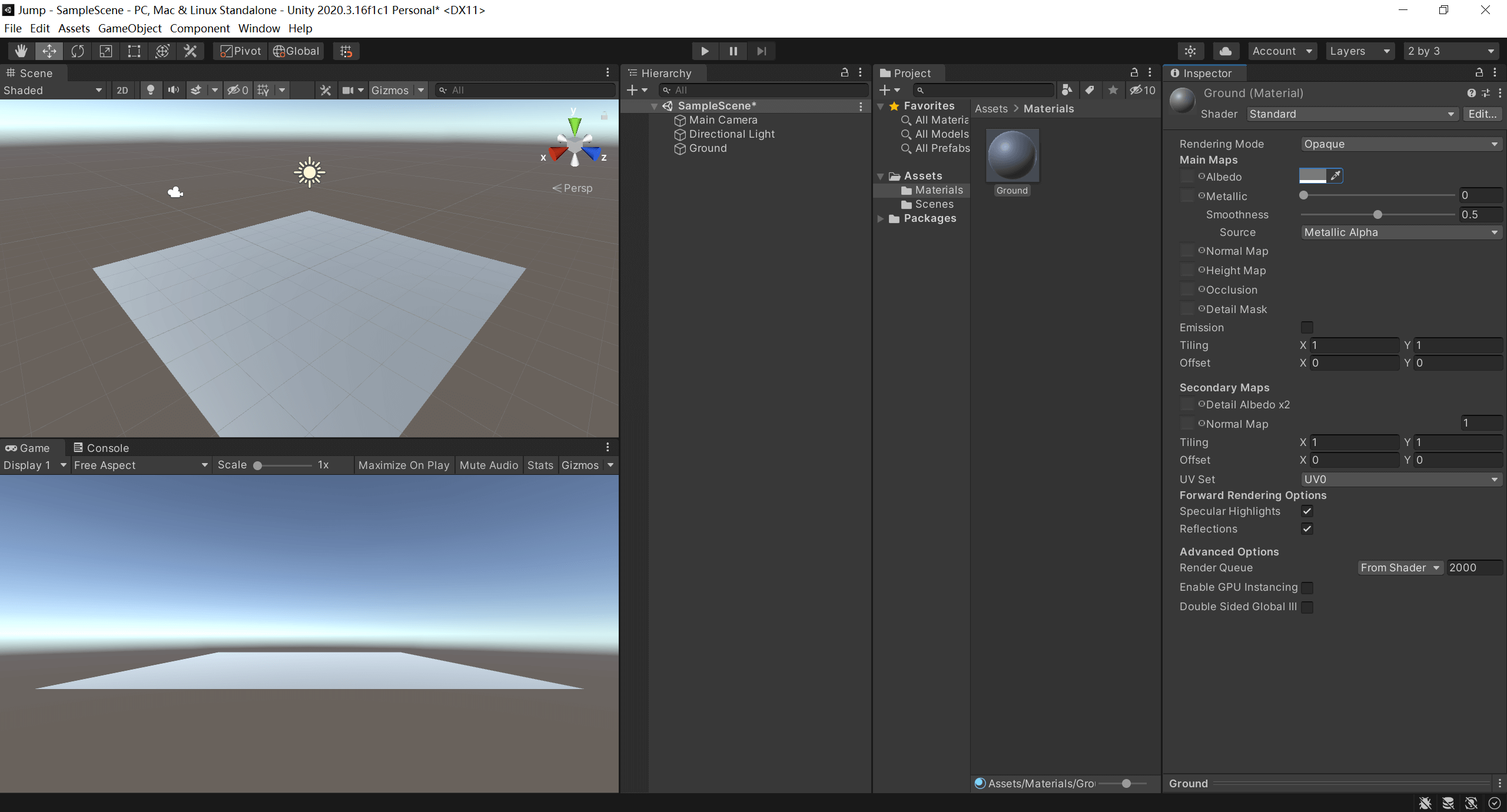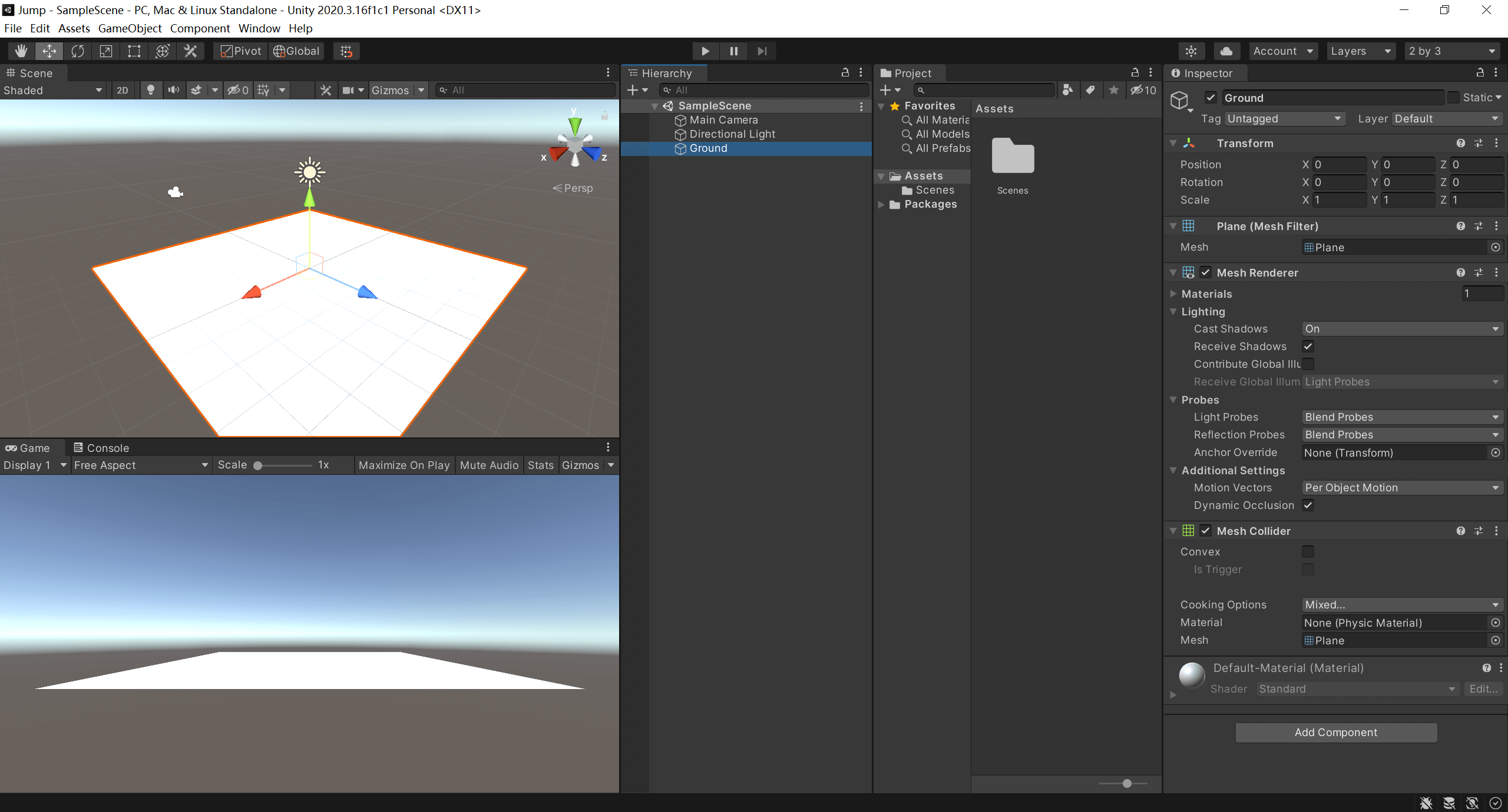 Ground颜色(默认Plane控件是不能设置材质颜色),创建一个Materials文件夹放入材质球